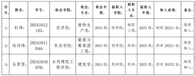 根据《石河子大学普通本专科学生管理规定》(石大校发〔2025〕28号)《石河子大学普通本科学生转专业管理办法》有关规定,结合《石河子大学药学院本科生转专业工作实施细则》,经个人申请、学院材料审查、面试及综合评审,拟同意轩烨等3名学生转入药学院相关专业,现予以公示。