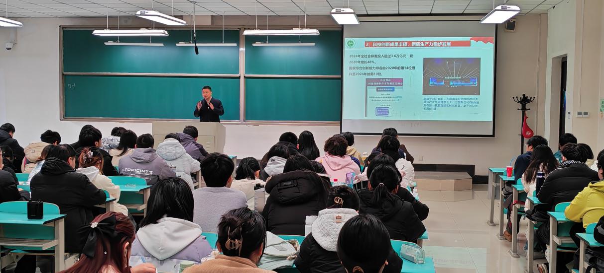 课堂上,李剑副校长从四个方面进行了讲解:回顾“十四五”时期我国在经济、科技、综合国力等方面取得的重要进展;阐明“十五五”时期在基本实现社会主义现代化进程中的关键地位与发展环境;解读“十五五”时期经济社会发展的指导思想、基本原则、主要目标与战略任务;并结合青年学生的成长实际,探讨如何将个人发展融入国家现代化进程。